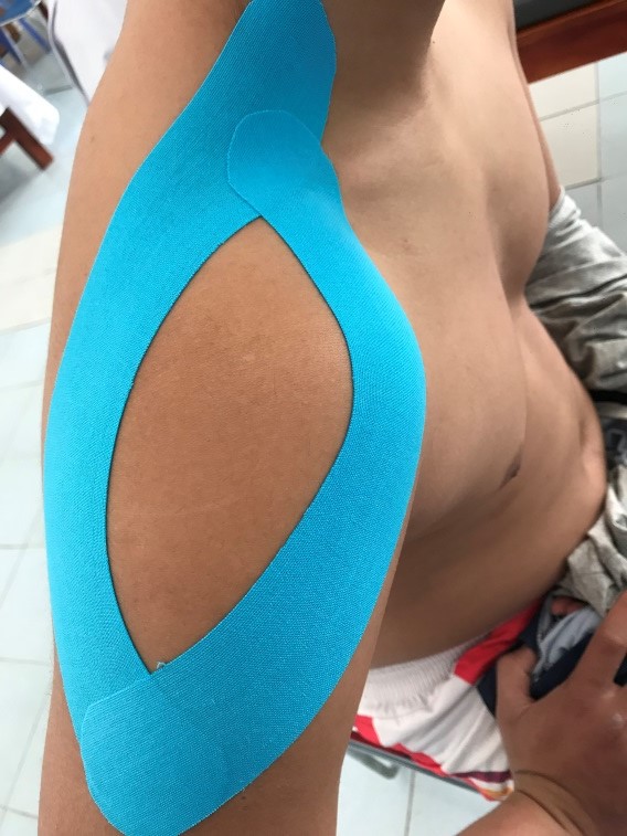 Chống tay vào hông. Dán phần gốc băng vào đầu cơ vai
