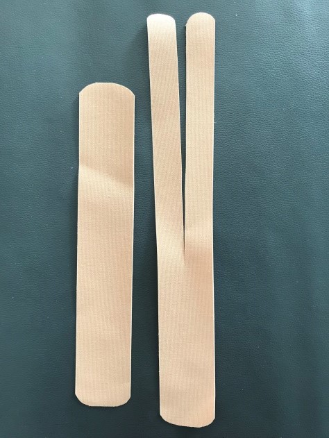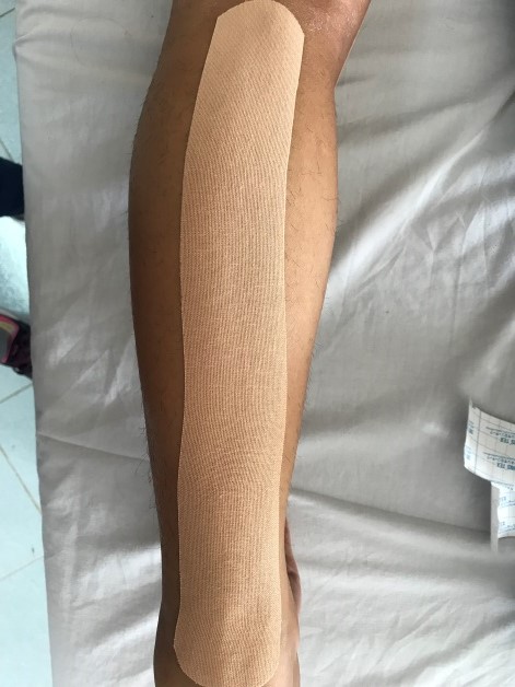 Giữ nguyên tư thế, dán dải băng chữ Y (phần không cắt) vào gót chân, dán hai phần đuôi chữ Y phía ngoài bao lấy cơ bắp chân xuôi lên khoeo chân. Phải đảm bảo vùng băng ôm được vùng cơ gân Achilles.
