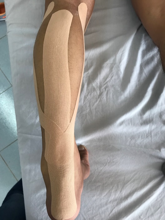 Nằm úp, duỗi thẳng chân, dán xuôi lên phần băng theo vùng gân Achilles